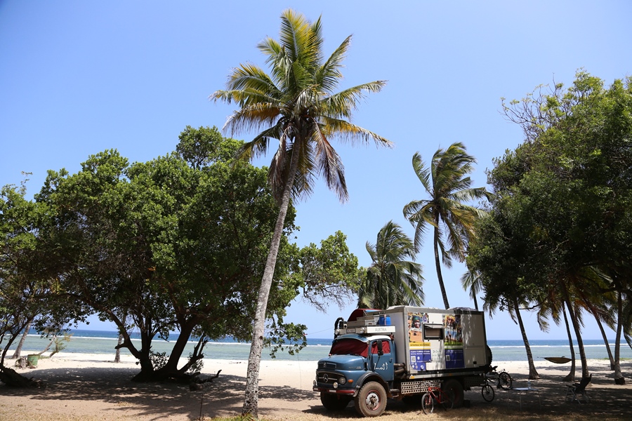 Bis an die Küste ist es nicht weit, keine 200 km, und nach Kenia ist es nur ein Katzensprung. Wir tauschen die angenehme Bergluft gegen schwülheiße Hitze am Indischen Ozean. Jeder, wirklich jeder reisende Overlander schwärmt von der Twiga Lodge nördlich von Diani Beach. Also, nichts wie hin! Uns geht es nicht anders. August parkt am Strand unter Palmen, vor uns das Meer, Colobusaffen, Meerkatzen und Vögel in den Bäumen, Schildkrötenspuren am Strand. Zudem eine gute Brise, sodass die Temperaturen erträglich sind. Traumhaft zu schwimmen bei Flut, frischer Fisch bis vor die Haustüre geliefert und andere Reisende. Und so ziehen die Wochen ins Land…
