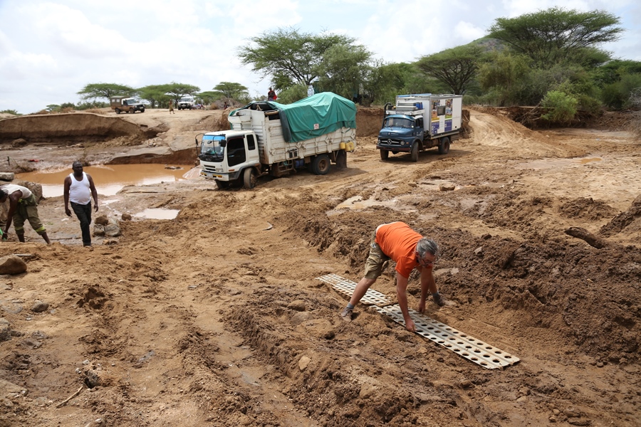 Von hier geht es in den wilden Norden Kenias. Wir lassen den Mount Kenia links liegen und machen uns auf den Weg Richtung Turkanasee. Wunderschön ist es hier im Samburuland, der Regen macht die Pisten allerdings anspruchsvoll. Eine Flussquerung ist unmöglich, zum Glück es gibt eine Alternativstrecke, die anfangs gut ist, doch dann fühlen wir uns wie auf einem Eislaufplatz. Wie durch ein Wunder bleiben wir nicht stecken. Und natürlich auch, weil Peter ein guter Fahrer ist 🙂 Dörfer gibt es nur wenige, eines davon ist Tuum, südlich vom Turkanasee gelegen. Die Strecke dorthin ist menschenleer, aber auch Tiere sehen wir keine. Eine seltsame Stille liegt über dem Land. Wir haben ein komisches Bauchgefühl. Anstatt im Busch zu nächtigen, fahren wir zu den Iren Steven und Angelina, die in Tuum eine Mission leiten. Die beiden schauen uns mit großen Augen an und fragen, wo wir denn herkommen. Sie erzählen uns von einem großen Viehdiebstahl, der vor 2 ½ Wochen ganz in der Nähe stattgefunden hat. Die Samburu haben den Turkana 1.600 Rinder gestohlen, dabei kamen 50 Menschen ums Leben. Jetzt herrscht große Angst, deswegen haben wir keine Menschenseele gesehen.