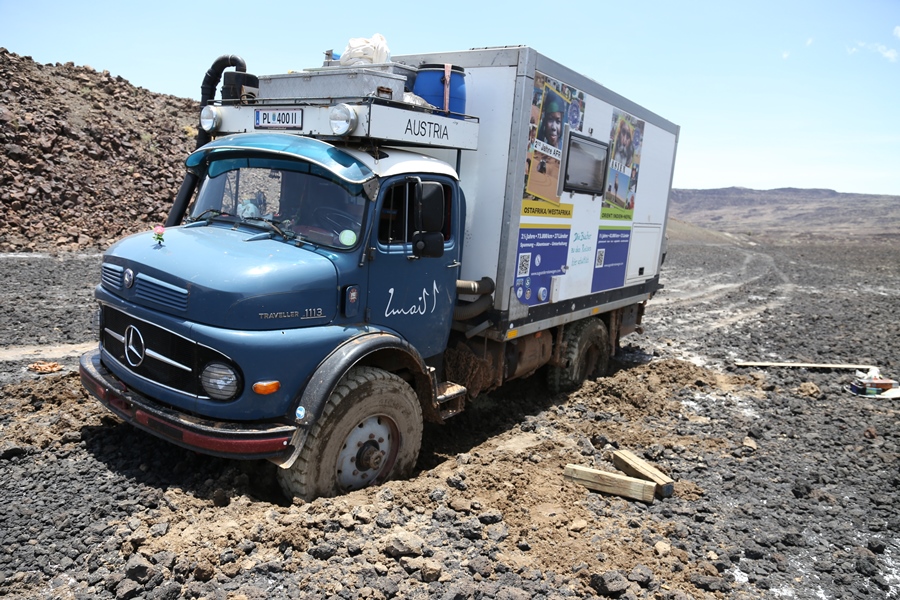 Am Rückweg passiert es, August bricht durch die scheinbar harte Oberfläche der Piste und versinkt bis zu den Achsen im Salzschlamm. Trotz enormer Hitze müssen wir jetzt schnell arbeiten, damit das Fahrzeug nicht noch tiefer einsinkt. Wir brauchen alles an Material, was wir haben: Sandbleche, Wagenheber, Hölzer, Steine. Körperlich sind wir an der Grenze. Nach 4 Stunden ist August befreit, was für ein Glück!