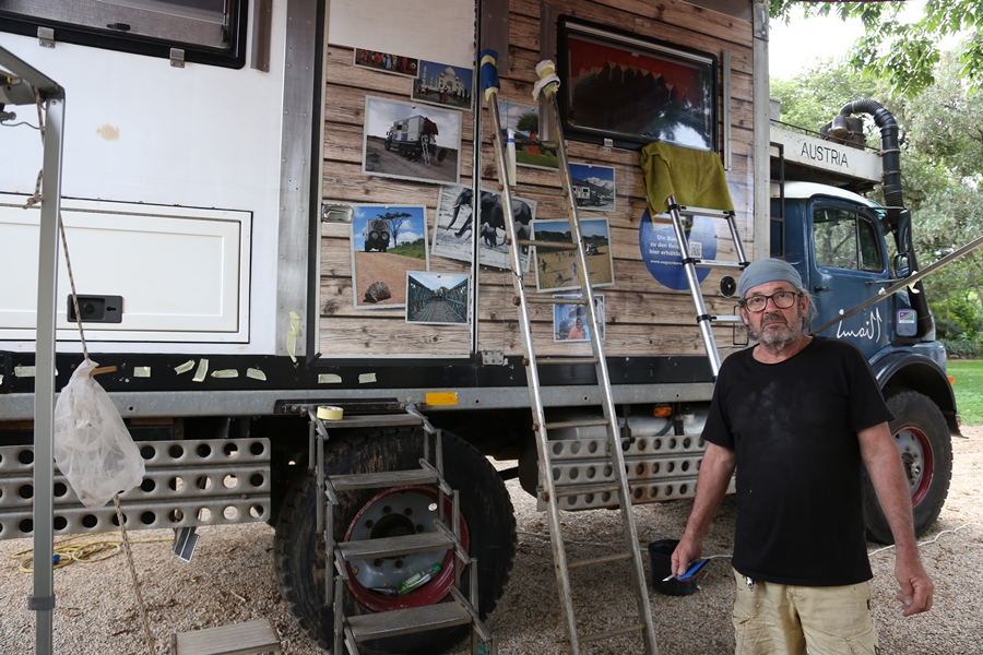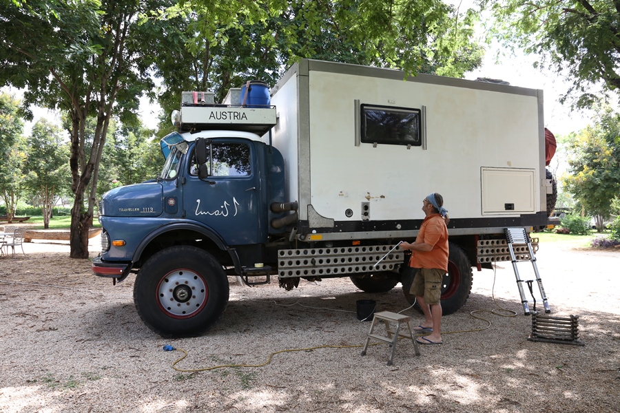 Insgesamt verbringen wir zwei Wochen mit den Deutschen. Rene hilft uns beim Arbeiten am August. Rechtzeitig vor Weihnachten bekommt unser Lkw ein Geschenk. Einen neuen Mantel!