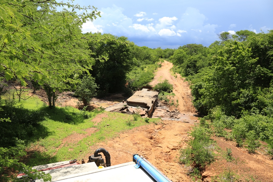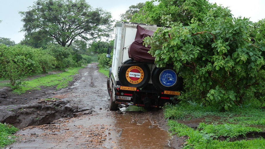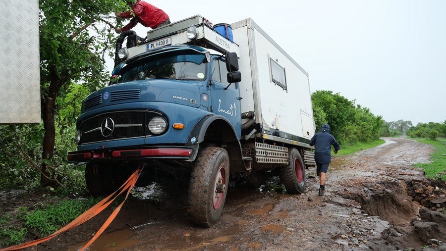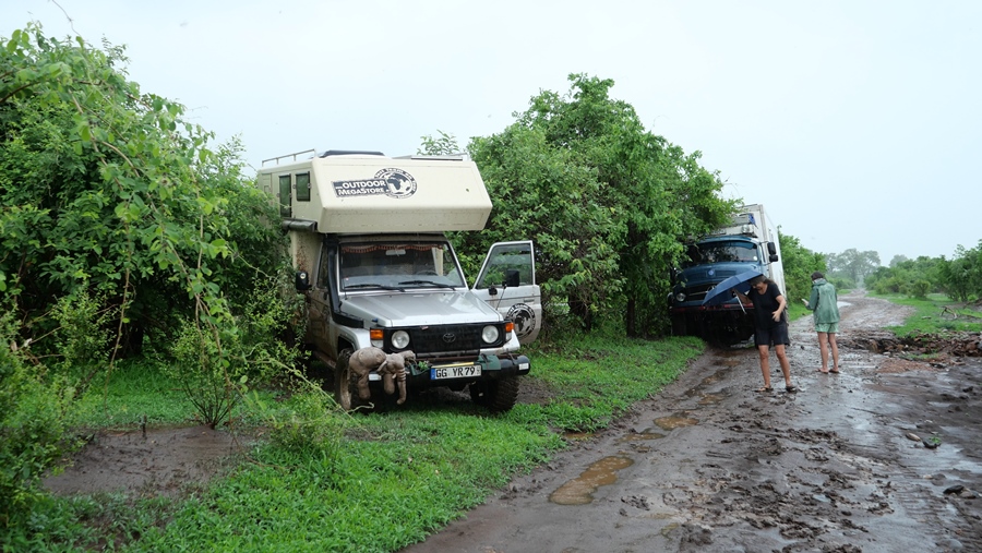 Als Probefahrt machen wir uns mit Yvonne und Rene auf ins Sambesi Tal. Es hat zwar schon geregnet dort, die Pisten sind aber noch befahrbar. Es ist schwül und heiß. Die Landschaft erstrahlt in sattem Grün, in vielen verschiedenen Schattierungen. Ein wunderschöner Kontrast zu den orangeroten Pisten. Doch bald macht der Himmel seine Schleusen auf. Nach nur drei Stunden Regen verwandeln sich manche Strecken in eine Rutschpartie. Wasser ist überall. Wege werden zu Bächen. Pisten beginnen wegzubrechen. August rutscht gegen einen Baum und kurz darauf bleiben wir stecken. Das rechte Hinterrad bricht ein. Schlamm vom Feinsten! Wir schneiden einen Baum weg, schaufeln und schließlich kann uns Rene rausziehen. Damit haben wir nicht gerechnet, immerhin ist August um fast vier Tonnen schwerer als der Toyota Landcruiser Buschcamper.